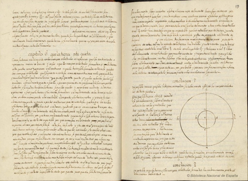 Diego Pérez de Mesa (1563–ca. 1632) was a professor of astronomy and mathematics at the University of Seville in the late 16th century. He gave classes on arithmetic, algebra, geometry, astrology, and navigation. Because he taught both university students and men training to be pilots, his lectures were in Spanish rather than Latin.Sometime around 1596 he gave a set of lectures on Sacrobosco’s Sphere. Although he never published these lectures, he did leave a set of manuscript notes, the Comentarios de Sphera, currently in the Biblioteca Nacional of Spain.