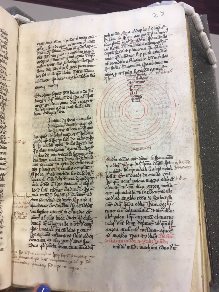 As Alison Ray points out, “most monasteries were flourishing centres of learning” in the Middle Ages. Although few medieval monastic libraries have survived into the 21st century, we can get an idea of the number and kind of books they owned by looking through library inventories. And it turns out that Sacrobosco’s Sphere was widely used in monasteries to teach monks astronomy. There were copies of Sacrobosco’s Sphere in monastic libraries all over Europe – at the Cistercian monastery of La Real on the island of Majorca, at a Carmelite house in Florence, at the Franciscan Convent of St. Antony in Padua, at a Franciscan cloister in Grünberg, Germany, and at multiple monastateries in England, including Leicester Abbey, Peterborough Abbey, Reading Abbey, Evesham Abbey and Ramsey abbey.